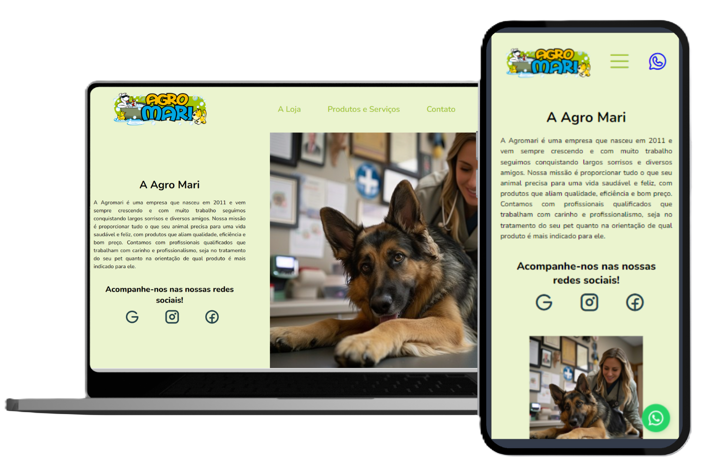 A página criada para o petshop tem como objetivo apresentar de forma clara e atrativa a loja, seus serviços e produtos. Com um design minimalista que respeita a identidade visual da marca, a plataforma proporciona uma experiência agradável aos usuários. Além de ser responsiva, garantindo acessibilidade em diferentes dispositivos, a página integra-se perfeitamente às redes sociais e ao Google Maps, facilitando a localização e o contato com os clientes.