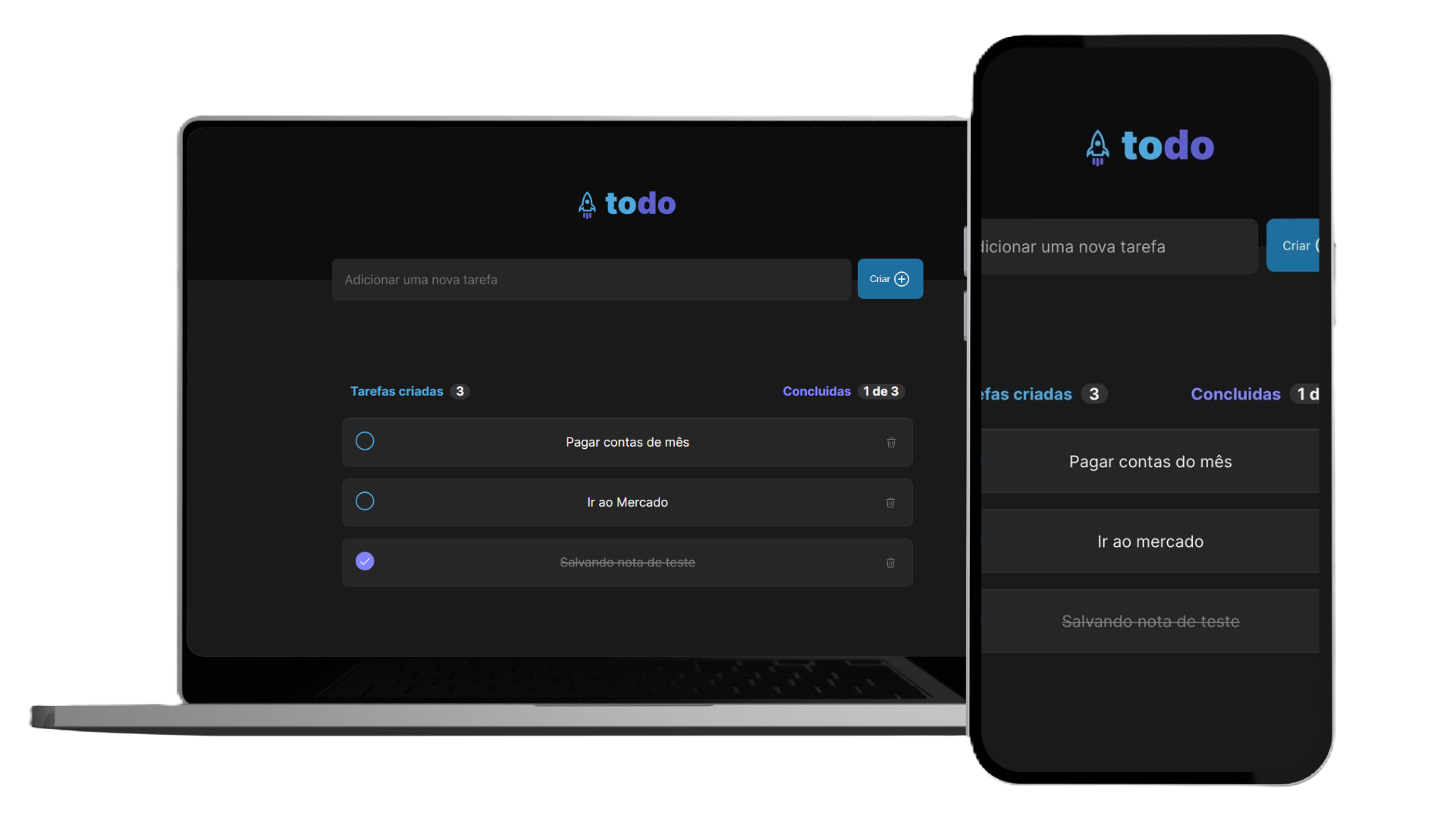 Aplicação para controle de tarefas e nela é posível: Cadastrar nova tarefa, marcar e desmarcar tarefas conccluídas, remover tarefas e ver o andamento das tarefas concluídas. Desenvolvido com ReactJS + Vite